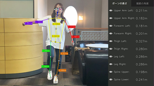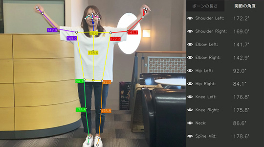 動画とカメラ映像から解析した骨格情報を基に、腕や脚などの長さ、肘など関節の角度をリアルタイムで計算して映像上に表示します。