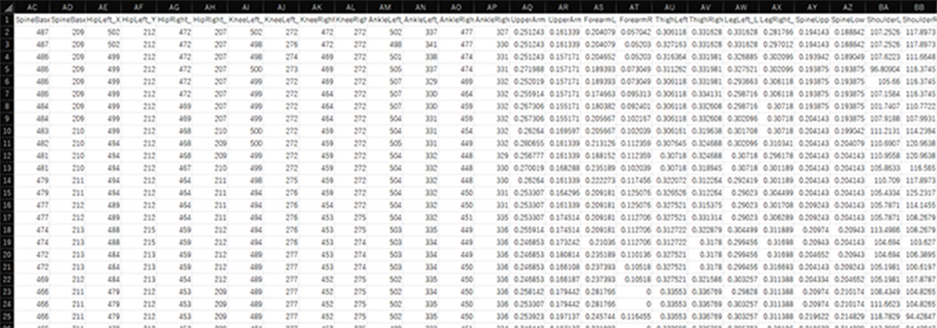 - 解析で得た測定データは、VisionPose の骨格推論のデータと共にCSV に出力します。骨格データと測定データはフレーム単位で同期しているので、関節の位置との関連付けが容易です。