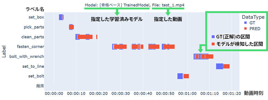 各ラベル(縦軸)が対象動画のどの時刻(横軸)で検知されているかを示します。対象動画にアノテーションが存在する場合、GT(正解ラベル)も表示されます。青帯のGT(正解)区間上に、赤色のPRED(推論)区間が被っている領域が多いほど信頼度の高い解析となります。