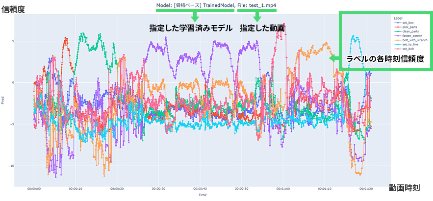 各ラベルが対象動画のどの時刻(横軸)でどの程度の信頼度(縦軸)となっているかを示します。折れ線グラフが独立したきれいな山を描いている場合、他のラベルの干渉が少なく信頼度が高くなります。