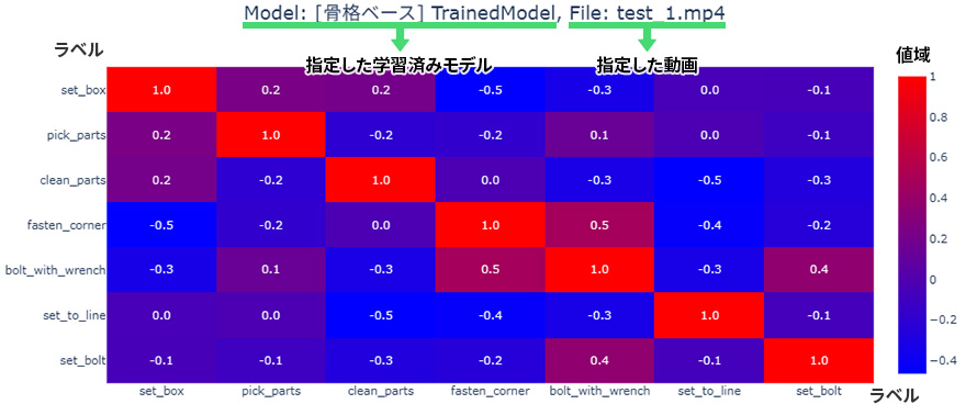 各ラベル同士の動きの相関関係を-1.0~1.0で示します。動きが似ているかどうかの差を判断し、1.0に近いほど正の相関で、-1.0に近いほど負の相関となり、0は相関がありません。ラベル同士の動きが近いと動きに干渉し合っている状態となっているため、教師データや学習済みモデルを生成する際の指標になります。