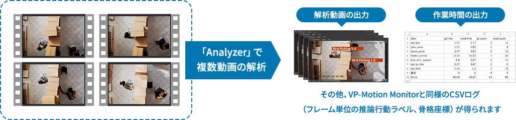 「VP-Motion Analyzer」は、ラベル別の作業時間を集計して出力できる機能と、複数の動画を解析できる機能を持った、動画専用の解析アプリケーションです。高速で処理を行うため動画解析の効率が飛躍的にUPします。